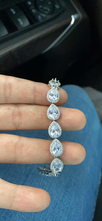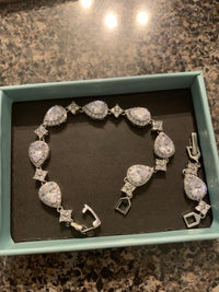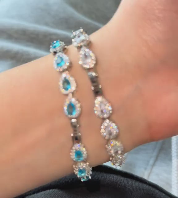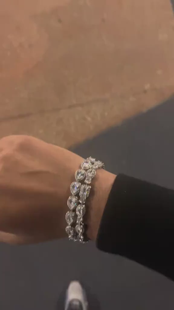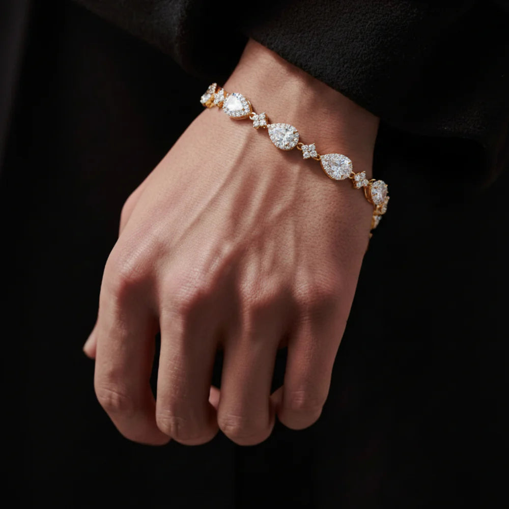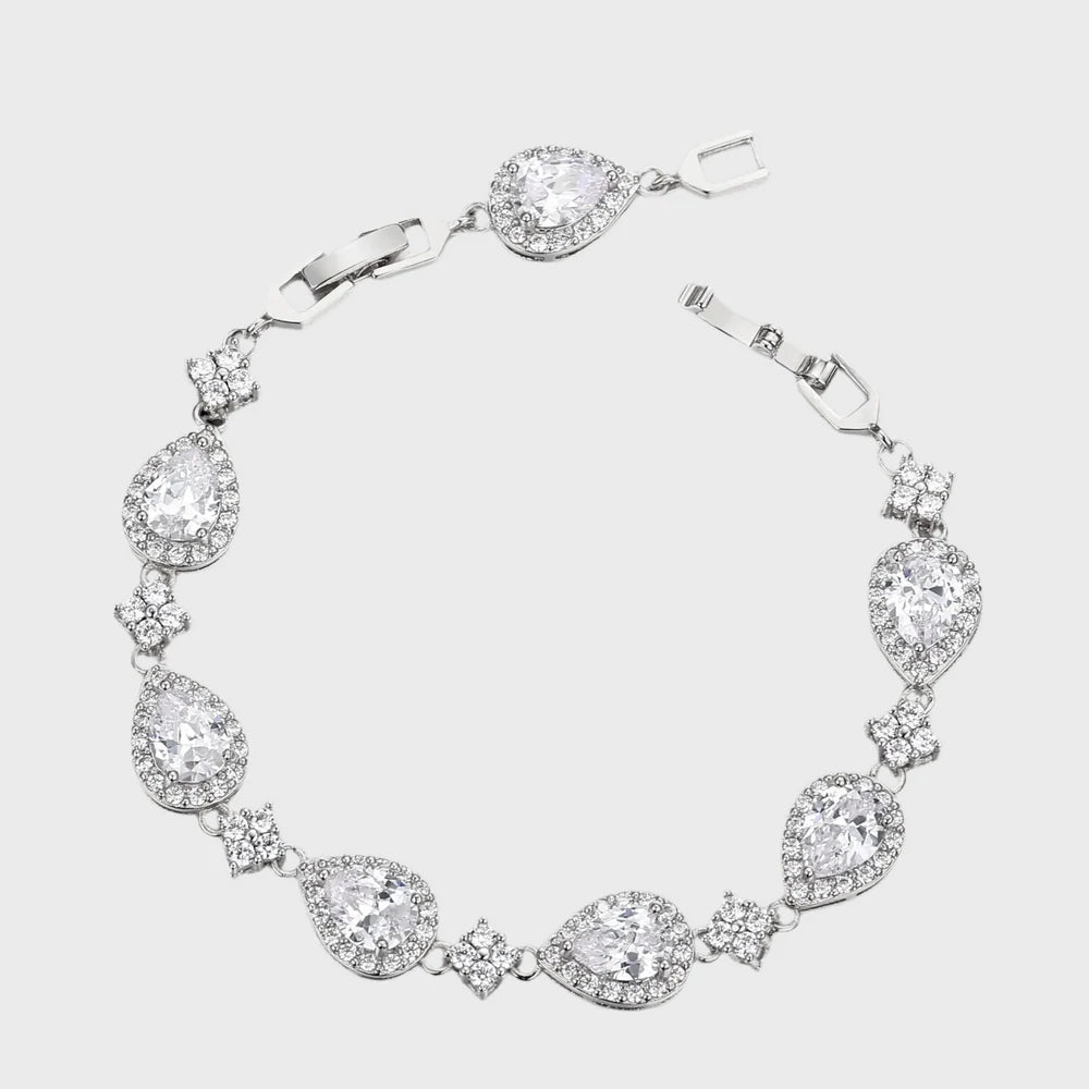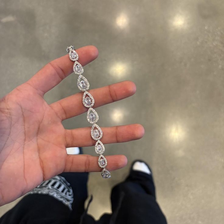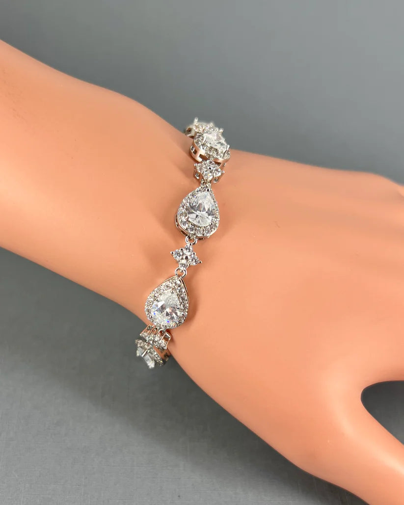 C’est un bracelet raffiné composé de cristaux taillés en forme de gouttes, entourés de petits éclats brillants. Il offre un style élégant et luxueux, parfait pour sublimer une tenue de soirée, un événement spécial ou apporter une touche glamour au quotidien.